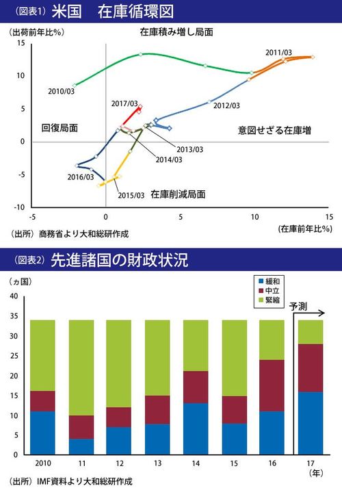 もともと2014年までに在庫が積み上がっていたところに先述したチャイナ・ショックが加わり、出荷の減少を受けてビジネスセンチメントを悪化させた米国企業は、2015年に在庫の圧縮を行った(生産は停滞ないし減少)。しかし2016年にかけて中国経済が落ち着きを取り戻すとともに、米国大統領選挙後に財政政策への期待なども相まって景況感が改善し、2017年にかけて再度、在庫水準を積み増す局面に入った。