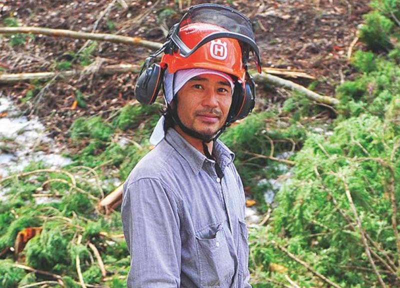 そうした飛騨市への移住でパイオニア的な存在が、仲間3人で山林施業会社のバルステクノロジーを14年1月に設立した藤田憲一郎さんだ。取締役に名前を連ねているが、藤田さん自ら山に入り、高さ20メートルほどに育った樹齢80年前後の杉の木を、チェーンソーを使って2分足らずで切り倒す。