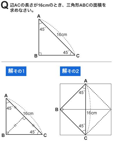解その2は、正方形を作り、その半分の面積を求める解法である。ACは正方形の対角線となるので、16×16÷2=128平方cmが正方形の面積である。