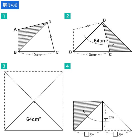 【図4】□×□=64 □=8 8×2-10=6cm □は辺ABの長さと等しいので、答えは6cm