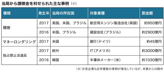 2017年4月には、ブラジルの大手建設会社がブラジル、スイス、米国の当局に26億ドル(約2900億円)の課徴金を支払うことで合意したと報じられました。実際に贈収賄が行われた国は中南米、アフリカの12カ国とされています。また、17年7月には、欧州連合(EU)が米国を代表する大手IT企業に対し、欧州における同社オンライン検索サービスにおいて、自社ショッピングサービスを優遇したとして、独占禁止法違反で24億2000万ユーロ(約3000億円)の課徴金の支払いを命じました。