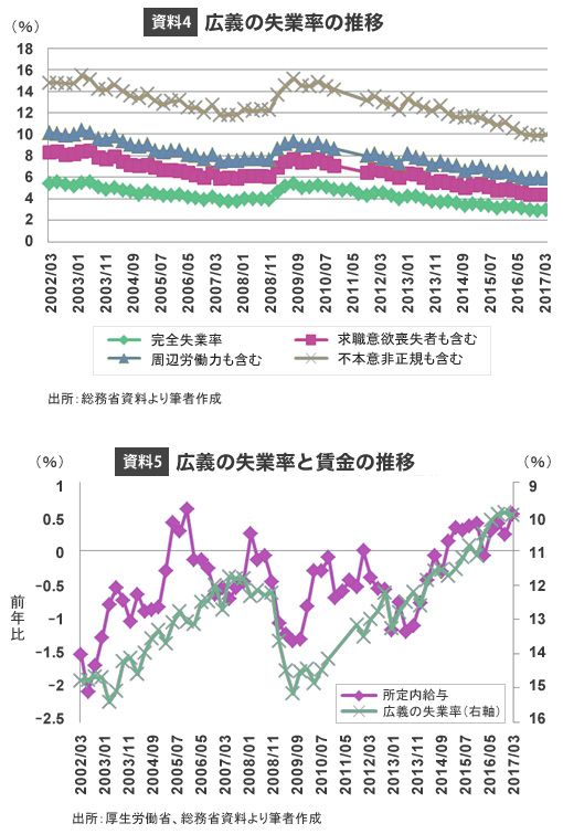 さらに、不本意で非正規社員になっている人まで含めた広義の失業率に至っては、同4~6月時点で10.0%と前期から0.1%ポイント上昇している。つまり、こうした広義の失業率で見れば、労働需給は明確なひっ迫を示していないことがわかる。つまり、労働需給がタイトになり、人手不足感が強まった状態で雇用を増やそうとすれば、企業は賃金を上げる必要性が出てくる。しかし、働きたくても求職活動をしていない人や、意図した雇用形態で働けていない人が多数存在する状況では、賃金が上がりにくい経済構造にあることを意味しているといえよう(資料5)。