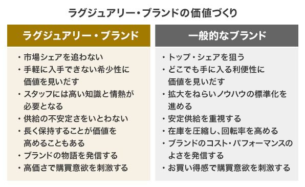 ラグジュアリー・ブランドには、同じ製品やサービスであっても、一般的なマーケティングとは異なるブランディングが必要となる(図参照)。そこでの問題は、効率追求型のビジネスで成功をおさめてきた企業が、新たにラグジュアリー・ブランドの構築に挑もうとすると、同一の組織に従来とは異なる動きを求めることになり、混乱や不徹底が生じることである。