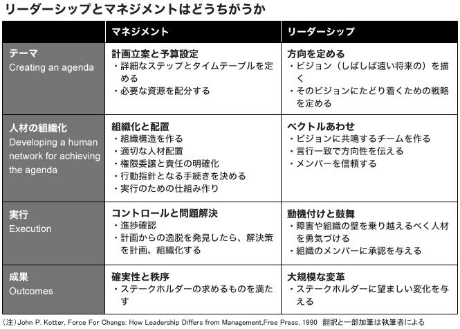 ではここで、代表的なリーダーシップ論として、ハーバード大学のジョン・コッター教授が1980年代後半に打ち立てた理論を紹介しましょう。その理論は、「リーダーシップ」と「マネジメント」を分けたところに特徴があります。