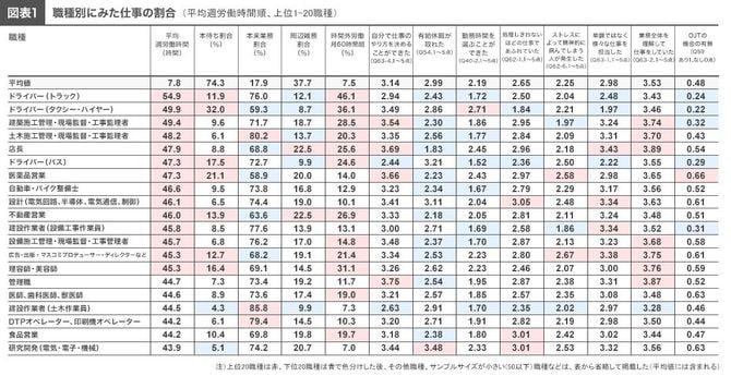 本来業務時間の割合が高いのは、建設作業者(土木作業員)85.8%、金属の製造・生産工程・修理作業者83.2%などの現業職や、開発職(ソフトウェア関連職)81.4%、プログラマ81.0%などのIT系エンジニアである。工期・納期を見据えて、細分化されたタスクに注力している姿が想像できる。