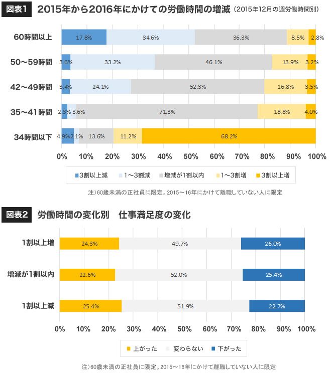 労働時間が1割以上減った人のうち25.4%は仕事満足度が上がっている。また、労働時間がほとんど変化していない(増減が1割以内)グループや1割以上増加したグループについてみても、2割強は満足度が上がっており、労働時間が減少した人の数字とそれほど変わらない。