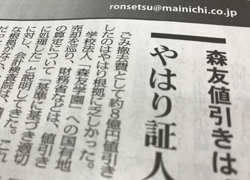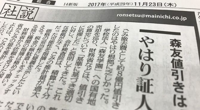 毎日新聞の社説(11月23日付)は「森友値引きは『根拠不十分』 やはり証人喚問が必要だ」(見出し)と主張する。