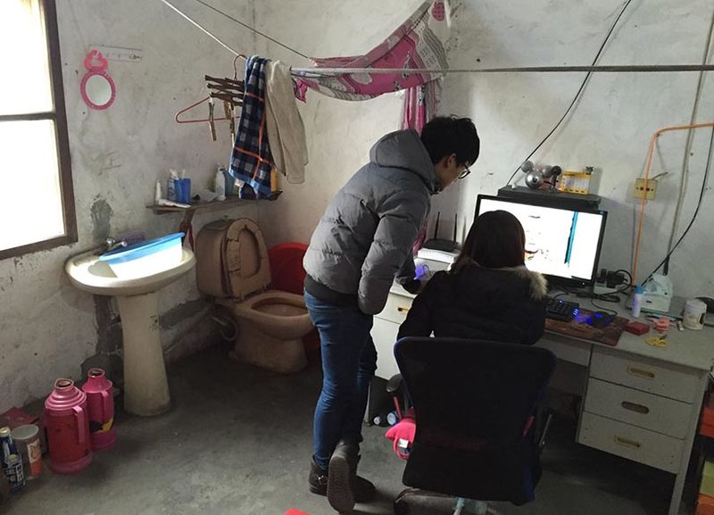 ここはバスルームで、居間や寝室は別にあるのかと思ったが、便器の右隣には大きな液晶モニターをのせた机、左隣には木製のベッドがある。「狭くてびっくりしたでしょう? 部屋はこの一つしかないんです。500元(8500円)の予算だと選択肢がなくて。上海は家賃が高いから。故郷にある実家は大きいんですけどね」と恥ずかしそうにシューは言うが、部屋の広さは10畳ほどはある。