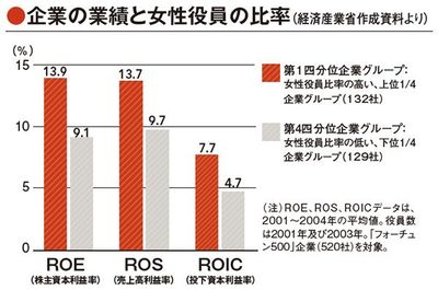 実際、女性役員の比率が高い企業は、利益率が高い傾向があるという調査結果もあり(下のグラフ参照)、株式市場での評価も高まると紹介されています。