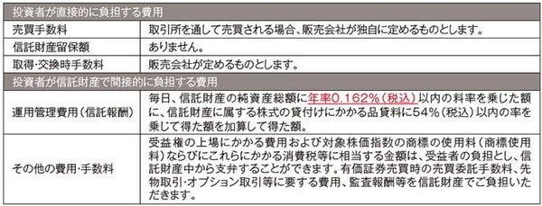※売買委託手数料などの「その他の費用・手数料」については、運用状況等により変動するため、事前に料率、上限額等を示すことができません。※売買手数料および取得・交換時手数料について、くわしくは販売会社にお問い合わせください。※手数料等の合計額については、保有期間等に応じて異なりますので、表示することができません。