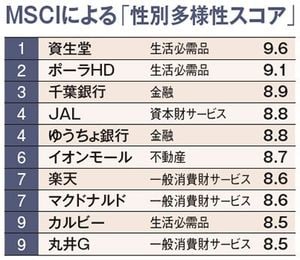 【大野】「ダイワWIN」は、WINに連動する日本初、現状唯一のETFです。今回のダイワWINでも、MSCIによる「性別多様性スコア」(上図)に基づき、女性活躍に積極的な企業が組み入れられています。当社はかねてより、社会的責任の取り組みが優れた企業を対象とするESG投資の分野に力を入れており、今回の商品もその一環。ダイワWINは、女性が活躍する企業を応援することがより一層の投資成果につながると期待して開発したものです。お伝えしたとおり、女性活躍企業には高い業績を残している企業も多く、当然ながらそれは株価にも反映されている部分があるはず。市場からの支持があれば、企業の取り組みはいっそう進み、それがさらに業績を押し上げるという好循環も生まれるでしょう。