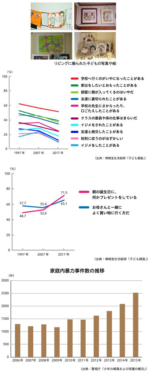 ただし、問題が全てなくなった、というわけでもありません。お互いソフトな親子の関係は、より濃密になりつつあり、「親の誕生日に何かプレゼントをしている」、「お母さんと一緒によく買い物に行く方だ」という項目も過去最高になりました。その反面、警察庁の統計では、子どもの家庭内暴力の発生件数が近年、小中高の全年齢で増加傾向にあることも示唆されているのです。