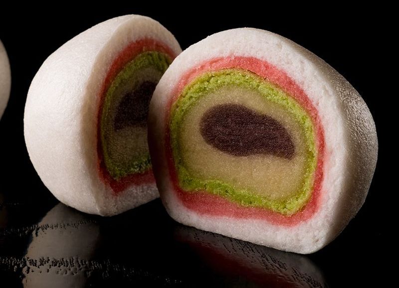 見た目はピンポン玉サイズのなんの変哲もない真っ白な饅頭なのだが、切れば「おっ!」とびっくり。雅な色合いの5色の層が現れる。