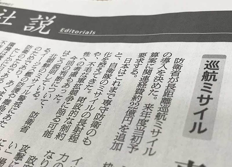 朝日新聞は、これまで日本が防衛力を増すたびに異を唱えてきた。「専守防衛の枠を超え、敵基地攻撃能力の保有となる」と批判し、長距離巡航ミサイルの導入に真っ向から反対する。見出しも「専守防衛の枠を超える」である。