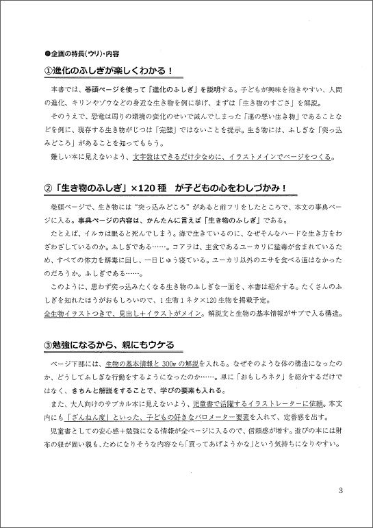 気になる新商品の企画書 #ヒット商品 #ベストセラー 2017/12/20 9:00 #15 #16 #17 #18 #19 #20 累計120万部「ざんねん」な事典の企画書 「うんこネタ」は意識して入れた PRESIDENT Online 高橋 ユキ +フォロー ライター 前ページ 1 2 3 4 5 『続 ざんねんないきもの事典』の企画書 以下、『続 ざんねんないきもの事典』の企画書を掲載する。Wordで作られたシンプルな企画書は、出版社では珍しくないものだ。第一弾である『ざんねんないきもの事典』から引き継ぐところ、続編で差別化するところなどについて、分かりやすく書かれている。 【関連記事】 "10分で寝る絵本"が日本で一番売れた理由 『うんこ漢字ドリル』爆発的ヒットの理由 「1本3000円」の売れすぎるシャープペン 海外旅行の味方、リアル"翻訳コンニャク" 「理不尽」に対抗するには、この5冊 1 2 3 4 5 高橋 ユキ(たかはし・ゆき) ライター 1974年生まれ、福岡県出身。2005年、女性の裁判傍聴グループ「霞っ子クラブ」を結成。翌年、同名のブログをまとめた書籍を発表。以降、傍聴ライターとして活動。裁判傍聴を中心に事件記事を執筆している。著書に『つけびの村 噂が5人を殺したのか?』(晶文社)、『暴走老人・犯罪劇場』(洋泉社)、『木嶋佳苗 危険な愛の奥義』(徳間書店)など。 <この著者の他の記事> 「自慰行為の動画を送ってよ」児童ポルノ犯がSNSで見つけたターゲットに使う卑劣な手口 関連記事 "10分で寝る絵本"が日本で一番売れた理由 『うんこ漢字ドリル』爆発的ヒットの理由 「1本3000円」の売れすぎるシャープペン ランキング 1位 だからハーンは「熊本は大嫌いだ」と書いた…セツの養父母まで呼び寄せた九州移住がたった3年で破綻したワケ ランキングをもっと見る ビジネス #ヒット商品 #ベストセラー #親子