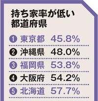 さらにこの数字は、より細かく見ていく必要がある。61.7%はあくまで全国平均。地域によって大きな差が存在する。持ち家率全国1位は、富山の79.4%。では、最下位は? 答えは東京で、その数字は45.8%だ。以下、持ち家率が低い順に沖縄、福岡、大阪と続く。