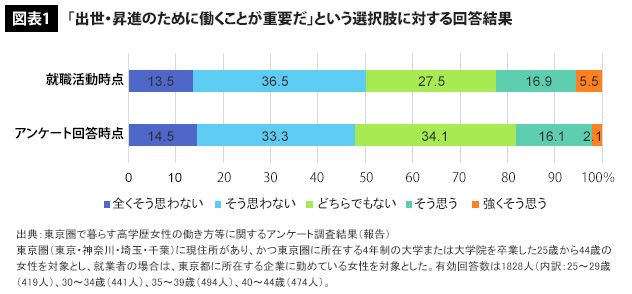 まず、アンケート調査結果によれば、「出世・昇進のために働くことが重要だ」と考えている女性(「そう思う」「強くそう思う」と回答した女性)は、結婚・出産などのライフイベントを経験する前の就活時点ですら、約2割にとどまっています。アンケート回答時点においても、その傾向はほとんど変わりません(図表1)。女性は出世・昇進への関心が低いという特徴が挙げられます。