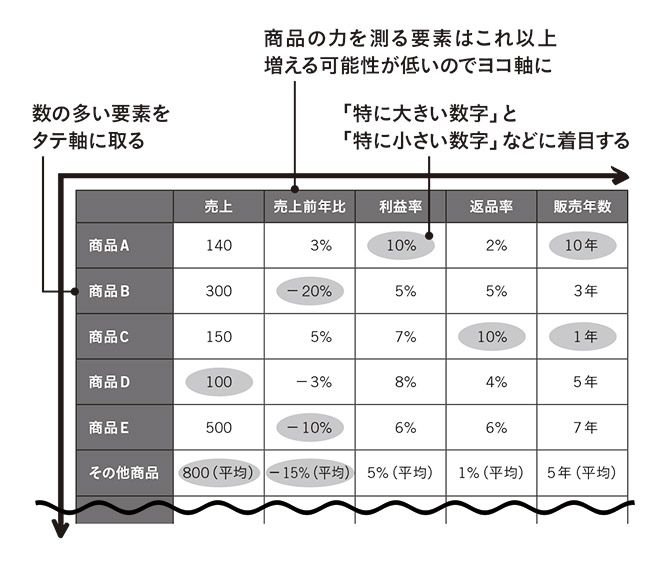 つまり、数が多くなるものがタテ軸にくるので、このケースの場合は、「商品」がタテ軸にくると考えられます。