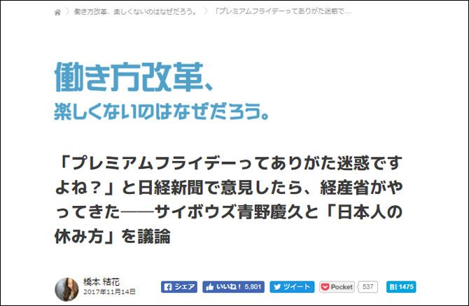 「私個人としては、それぞれの裁量で働きたい時に働いて、休みたい時に休めばよくて、金曜日じゃなくてもいいと思っています。プレミアムフライデーを企画した張本人が言うのもなんですが」
