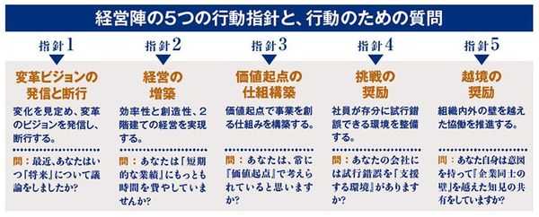 イノベーションの主役は、成功体験を持たない身軽なスタートアップ企業と考えられてきた。しかし、年数を重ねた企業は人材やノウハウ、資本という貴重な経営資源を蓄積しており、それらを生かさないままで日本経済の飛躍はない。「大企業からイノベーションは興らない」という定説を覆すため、イノベーションに関して先駆的な取り組みを行っている日本の大企業経営者をメンバーとした「イノベーション100委員会」が立ち上がり、レポートを公表した。そのレポートで、経営陣の五つの行動指針を示し、行動を起こすための100の質問を投げかけている(下図に抜粋して紹介)。経営に携わるすべての人間が一度は自問すべき事柄である。