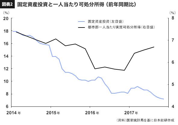第1は、家計の所得環境の改善で、個人消費の景気牽引力が高まっていくことである。企業業績の回復や人材確保のための賃上げなどを背景に、都市家計の可処分所得は2017年に入り増勢が高まっている(図表2)。逆に、これまでの高成長を主導してきた固定資産投資の増勢は鈍化しており、景気拡大の主役が投資から消費にバトンタッチしつつある。実際、GDP(国内総生産)に占める個人消費の割合は2011年から緩やかな上昇傾向を続けている。