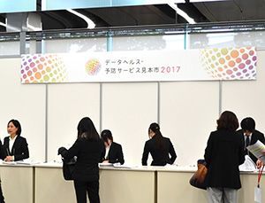 会場内で人だかりが目立ったのが、野村総合研究所と九州大学発のベンチャー企業・カルナヘルスサポート(本社・福岡市)がコラボレーションで出展したブース。「保健事業のフルサービス提供」をコンセプトに、現状分析から施策改善までトータルにサポートするサービス体系を打ち出している。具体的には「健康スコア」「生活習慣病重症化予防プログラム」「革新的施策プロデュース」の3つだ。