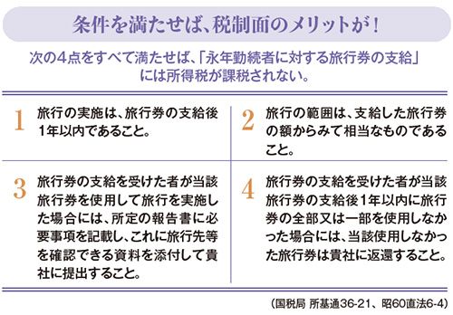 「通常、旅行券は表彰金や商品券などと同じく、税法上は給与の扱いとなり、贈られた社員の方に所得税が課せられます。でも旅行券に限って『贈られて1年以内に利用する』などの条件を満たせば、非課税となるのが重要なメリット。もちろん会社側は、その費用を福利厚生費として処理することができます」(詳細は下図参照)