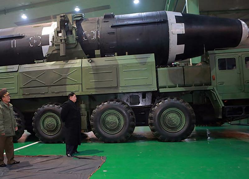 現状打開の道は、事実上北朝鮮の体制転換以外にない。だがその変動は、日本の地政学的地位に構造的変化をもたらすかもしれない。北朝鮮の長距離ミサイル「火星15号」を視察する金正恩党委員長(写真中央、写真=KCNA/UPI/アフロ)