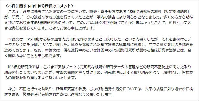 iPS細胞の研究でノーベル賞を受賞した山中伸弥所長も1月22日の記者会見で捏造を認めて謝罪している。研究所のホームページで山中所長は以下のコメントを出している。
