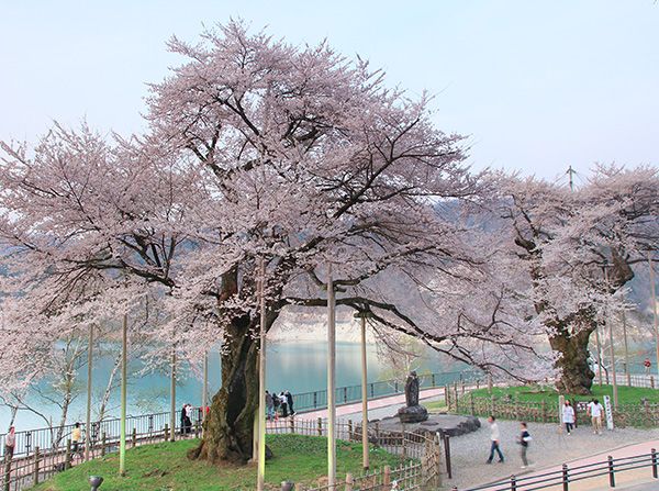 御母衣湖の湖畔で見事な花を咲かせる2本の荘川桜。湖に沈む照蓮寺、光輪寺の境内から移植された。