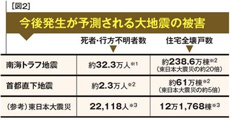 従来から住宅やビルの耐震化の重要性は叫ばれているが、依然として首都直下地震では全壊・全焼建物は約61万棟、南海トラフ地震では津波による流出なども加わり、東日本大震災の約20倍に上る約238.6万棟が全壊すると予想されている(図2)。
