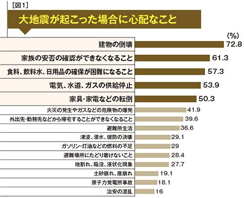 地震発生時に多くの人が心配しているのは、まずは「建物の倒壊」である(図1)。このほか道路の寸断なども予想されることを考えてか、「食料、飲料水、日用品の確保が困難になること」も上位に上がっている。こうした不安を抱くのは、過去の数々の震災で家やビルが崩れたり、インフラが被害に遭う様子を目にしたからだろう。