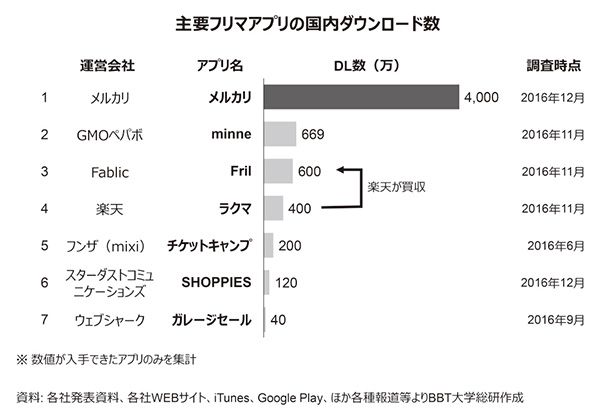 主要フリマアプリの国内ダウンロード数を比べてみると、メルカリの4000万という数字は断トツで圧倒的です。minne(ミンネ)やFril(フリル)などの先行サービスは1000万ダウンロードにさえ達しておらず、文字通り桁違いの強さを見せています。