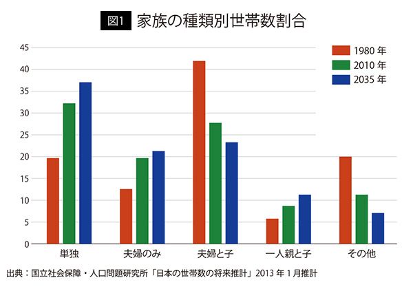 一人で居を構える「単身世帯数」は一貫して増え続け、1980年には総世帯に占める割合は19.8%だったが、2010年には32.4%に達し、2035年には37.2%が「一人暮らし」になると推計されている(図1参照)