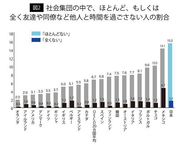 国際機関OECD(経済協力開発機構)の調査(2005年)によれば、友人、同僚、その他コミュニティの人と「ほとんど付き合わない人」の比率は、日本は15.3%と平均(6.7%)の2倍以上、加盟国中トップ(※)だった。(図2)オランダの2.0%、アメリカの3.1%、ドイツの3.5%などに比べると差は歴然だ。