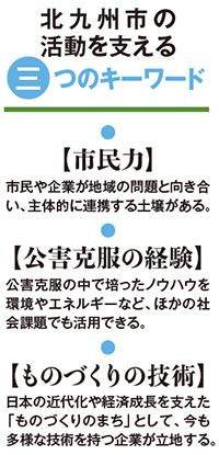 【北橋】北九州市は、08年に環境モデル都市、11年に環境未来都市に国から選定され、さらに世界で4都市だけのOECDのグリーン成長都市にも、パリ、シカゴ、ストックホルムと並んで選ばれています。これらは、単に環境保全の領域にとどまらず、社会面、経済面を含め、まさに“持続可能なまちづくり”が評価されたものです。環境、エネルギー、高齢化対応をはじめ、これまで各方面で実践してきた地道な地域活動、市民活動が、SDGs関連の取り組みの確固たる基盤になっていると考えています。