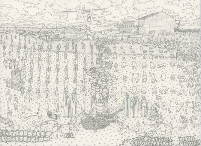 私は、いつもこの作品の制作過程で、現地の人々との対話の中からゴールとするイメージを共につくる。そして、それを絵に描く。絵は参加者を集めたり、許可をとったりするのに役立つ。それを使いながら、現実の写真を作っていくのだ。