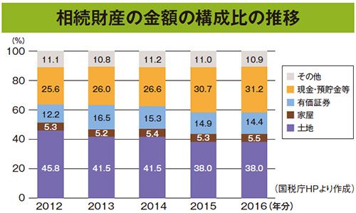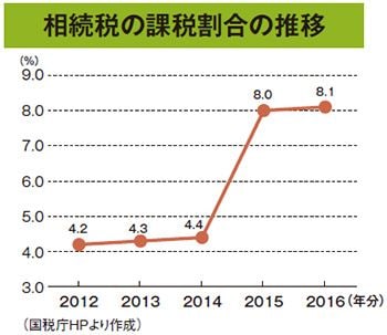 2013年度の税制改正以降、相続税の課税対象世帯は大幅に拡大した。国税庁の資料によれば、相続税の課税割合は13年度改正反映前までは4%台で推移していたが、改正以降は8%台とほぼ倍増している。東京都を管轄に持つ東京国税局の場合数字はさらに高く、16年分は12.8%に上る。相続財産の構成比で見てみると、最も割合が高いのはやはり土地だ。