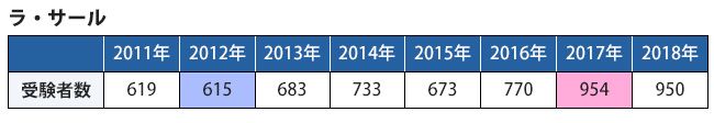 ラ・サールは2010年以降、東大合格者ランキングのトップ10から姿を消している。2011年には29人と低迷。中学の受験者数も減少傾向が続いていたのだが、2012年より受験者数は増加に転じている。2012年の615人から、13年683人→14年733人→15年673人→16年770人→17年954人と増え、18年は950人だった。