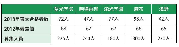 2012年の主要な私立中高一貫校の偏差値と今年の東大合格者数を照らし合わせて見ると、麻布の健闘が目立つ。今年、麻布の東大合格者数は98人(昨年は78人)。四谷大塚の2012年結果偏差値によると「聖光学院68 駒場東邦・栄光学園67 麻布66 浅野65」となっており、同じ偏差値帯の学校と比べると圧倒的に東大合格者数が多い(開成の偏差値は72)。麻布としては2003年の109人以来の好結果である。