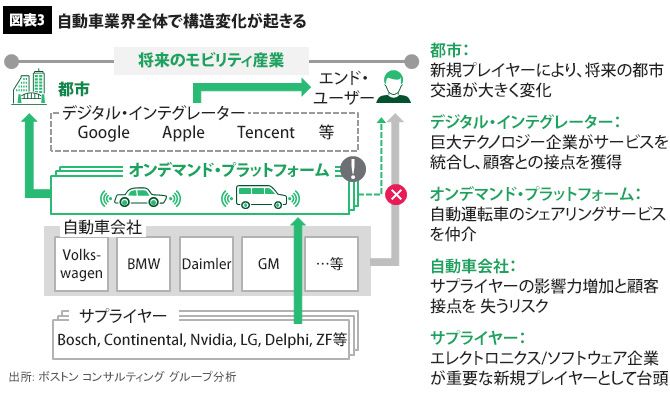 以上のことを総合し、自動車業界で起きている構造変化をわかりやすい図に起こすと、自動車会社とエンドユーザーの間にもう1つ、オンデマンド・プラットフォームが入った形になる(図表3)。ここでは、グーグルやアップル、テンセントなど異業種のプレイヤーも、デジタル・インテグレーターの座を狙って続々と参入してきている。オンデマンド・プラットフォームに対するサプライヤーの影響力は増す一方で、自動車会社は顧客との接点を失いかねない状況に置かれている。
