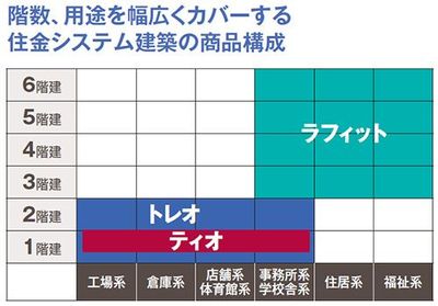 同社の強みの一つは商品の多彩さだ。平屋専用規格型の「ティオ」、自由設計型の「トレオ」、6階建てまで対応できる中低層型の「ラフィット」をラインアップし、工場や倉庫はもちろん、店舗、住居、事務所、学校、福祉施設などをカバーする。