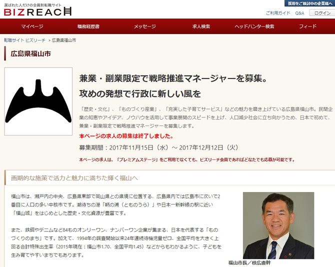 そこで興味深い動きがある。広島県福山市が昨年11月、転職サイトの「ビズリーチ」上で、兼業・副業を前提とした人材募集を行ったところ、395人の応募が集まったのだ。このうち5人が今年3月から福山市で働いている。仕事の内容は人口減対策の若者定着や女性の子育て支援に関わる施策の企画・推進。「戦略推進マネージャー」として民間企業の立場から市長などに助言する。