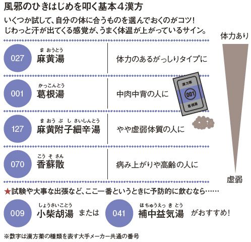 ひきはじめに飲む漢方としては、よく知られている葛根湯(かっこんとう)に加え、麻黄湯(まおうとう)、麻黄附子細辛湯(まおうぶしさいしんとう)、香蘇散(こうそさん)の計4種類があります。葛根湯は中肉中背の人向けで、よりがっしりしたタイプの方は麻黄湯、虚弱気味な体質の方は麻黄附子細辛湯や香蘇散と、体質に合わせて飲み分けます。