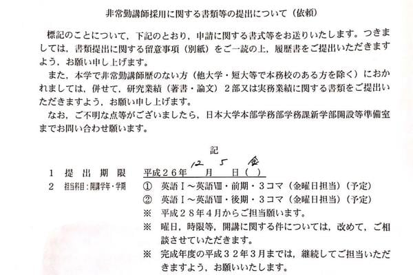 問題はそれだけではない。日本大学は、今回解雇を告知した非常勤講師全員に、2014年の時点で、2016年から最低4年間の継続雇用を伝えていた。実際、井上さんが危機管理学部の非常勤講師に採用された時、大学から受け取った文書には「完成年度の平成32年3月までは、継続してご担当いただきますよう、お願いいたします」とある。