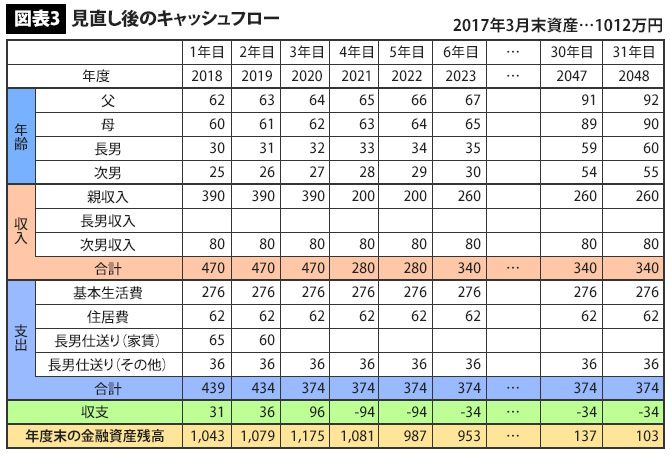 「現在の預貯金と収入で暮らしていけるだけの生活費を試算してみました。図表3をご覧ください。お父様、お母様、ご次男3人の生活費は月40万円から月23万円に見直していただきます。また、ご長男への仕送り額は現在の月15万円から月3万円となります。この仕送りと障害年金(年78万円)で暮らしていけるように、公営住宅の申請手続きを進めていきます」