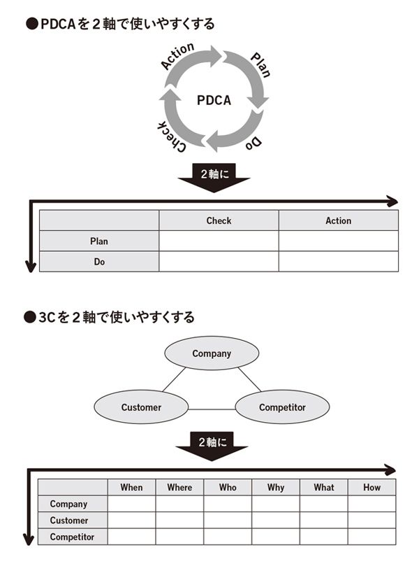 2軸に落とし込むと、「P」(計画)と、「D」(行動)のそれぞれに対して、「C」(チェック)をして、そのチェックの結果、それぞれに対して「A」(アクション)を決めるということが、わかりやすく図解できます。