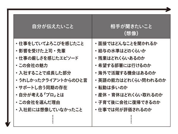 ただし、「聞きたいこと」は、自分が聞き手になったつもりで考えているため、あくまでも「想像の世界」です。もし、可能な場合は、聞き手もしくは聞き手に近い人に意見を聞くとよいでしょう。
