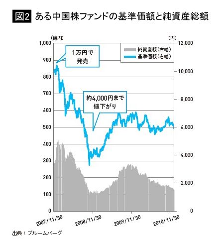 ところが、2007年秋にピークをつけた中国株は、その後、下落していきました。株価がピークに達した2007年11月に設定された中国株ファンドの行く末を見てみましょう。図2は、ある運用会社の中国株ファンドです。2007年11月30日に設定されています。