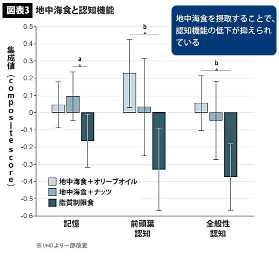 ここでも、「1週間に1Lのオリーブオイルを提供」とみると、スペインと日本の文化の違いを感じますが、それでも前に進みましょう。結果は図3です。薄い色から順番に、地中海食+オリーブオイル、地中海食+ナッツ、脂質制限食を示しています。詳しい説明は省きますが、「記憶」だけでなく、その他の認知機能においても、地中海食の摂取が認知機能の低下を抑えている結果となりました。なお、オリーブオイルをふんだんに使用したグループと、ナッツを使用したグループの間では、大きな差は見られませんでした。